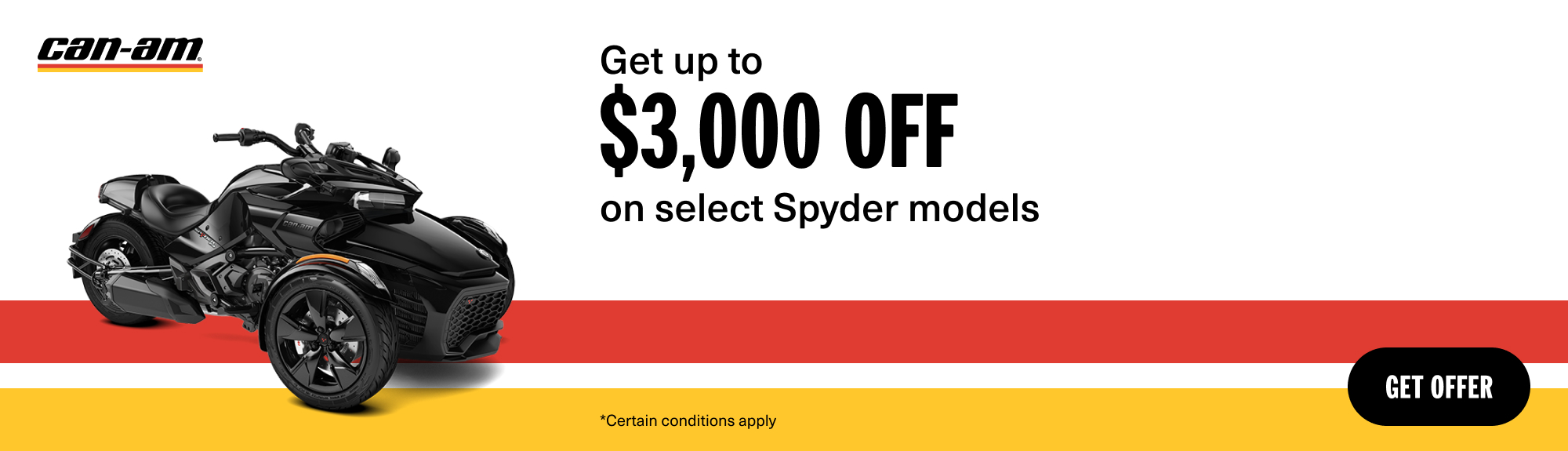 ©2025 Bombardier Recreational Products Inc. (BRP). All rights reserved. ®, ™ and the BRP logo are trademarks of BRP or its affiliates. In the U.S.A., products are distributed by BRP US Inc. Offers valid in U.S.A. only between February 1, 2025 - January 31, 2026. The conditions may vary depending on your location and this offer is subject to termination or change at any time without notice. This offer is not refundable, exchangeable or transferable (including from one dealership to another), cannot be redeemed for cash, credit or other products of equivalent value. Null where prohibited by law. Until supplies last. Eligible units are all new and unused 2025- 2022 Can-Am Spyder and Ryker models. Other Can-Am On-Road models may qualify for other promotions, see local dealers for details.